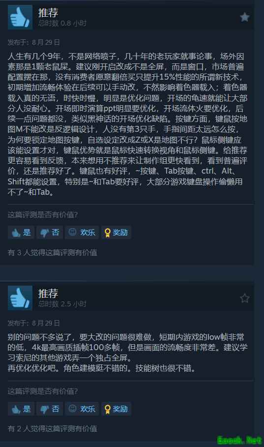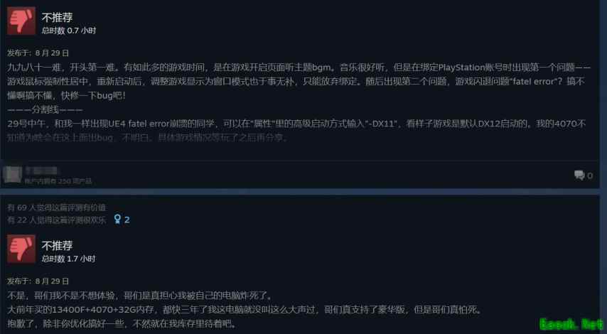 除开场外因素造成的负面评价外,游戏本身的问题也十分严重,许多玩家表示出现了严重的优化问题,掉帧、卡顿甚至无法进入游戏的bug频出,一连几条高赞差评全在吐槽优化问题,用着4070的玩家都表示电脑的风扇呼啸声令人害怕。甚至连为数不多的好评,也指出了游戏优化糟糕的问题。