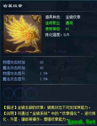 当角色等级达到61级,还将解锁“坐骑纹章”系统——这是坐骑的专属装备。在骑乘状态下,纹章可为角色提供额外属性加成。纹章共分五个部位:前部、后部、中部、左部和右部,各自拥有不同的属性效果。通过炼化与升星,还能进一步提升纹章属性,打造属于你的最强坐骑装备!