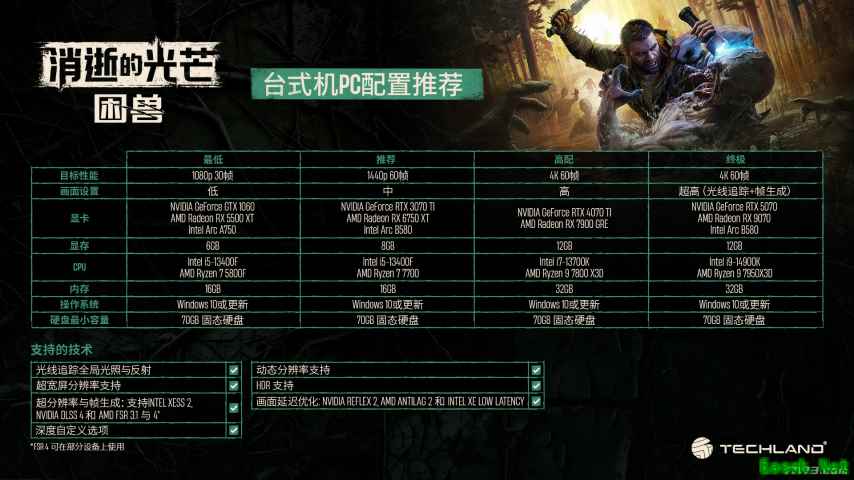 Techland官方在今日公布了《消逝的光芒:困兽》的PC配置需求。这款将于9月19日正式发售的丧尸生存动作游戏,最低仅需GTX 1060显卡即可运行。 想要获得1440p/60帧的游戏体验,则推荐使用NVIDIA GeForce RTX 3070 Ti或AMD Radeon RX 6750 XT显卡。 官方非常贴心地公布了多档配置需求,玩家可以根据自己期望的游戏体验选择对应的硬件配置。 台式机配置需求: