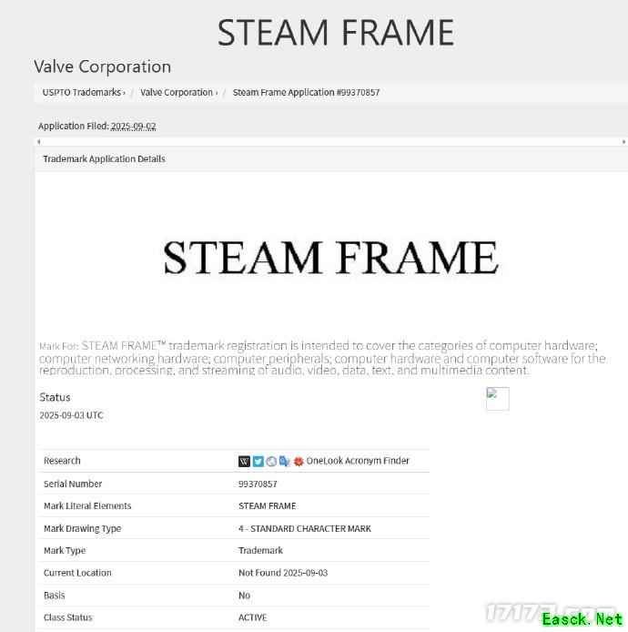 近日,热心玩家在Reddit论坛发现,Valve公司已于2025年9月2日正式提交了名为Steam Frame的商标申请。 申请文件显示,该商标注册涵盖两个关键类别:一类是“娱乐性电脑游戏主机、电子游戏机及电子游戏配件控制器”;