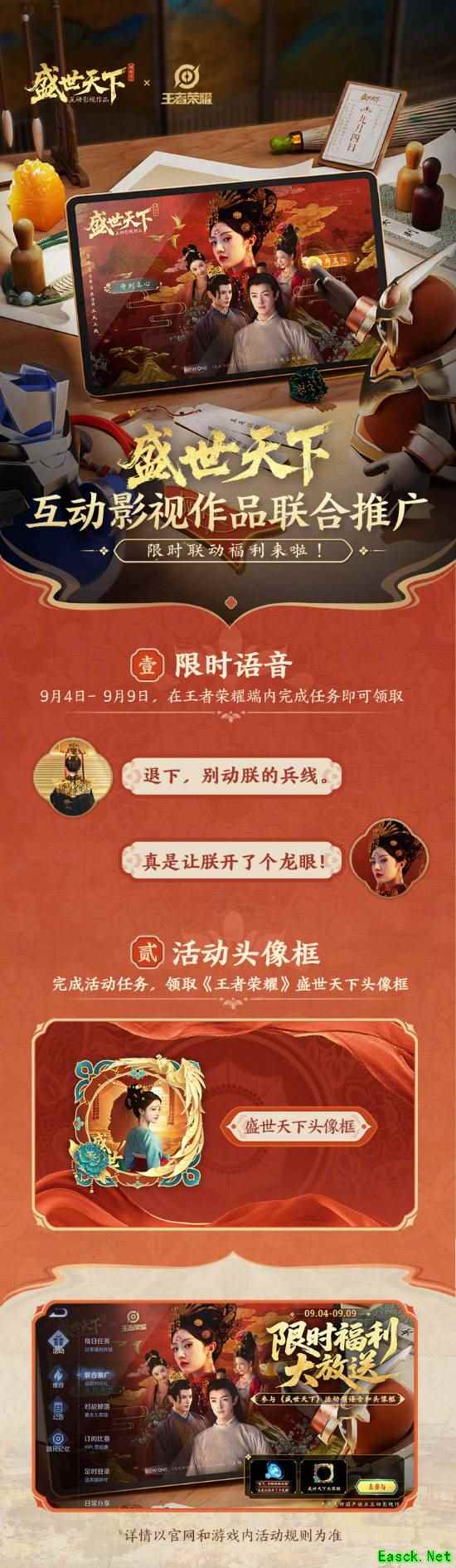 今日,《王者荣耀》官微宣布,9月4日至9月9日,在王者端内参与《王者荣耀》x《盛世天下》联合推广活动,即可获得限时语音【退下,别动朕的兵线】【真是让朕开了个龙眼】(30日)以及盛世天下头像框。 邀请好友助力,还有机会赢取更多游戏道具礼包。