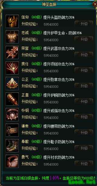 十大血脉对应十大装备部位,分别以“信仰、忠诚、荣誉、责任、公正、正直、怜悯、谦卑、奉献、勇气”为名,属性加成精准覆盖每一处装备细节。每提升一层血脉等级,对应装备的属性效果将获得显著增强。玩家可依据职业特性与战斗风格,有针对性地强化关键部位,打造个性化战斗体验。血脉升级需消耗经验值与绑银,如何高效分配资源成为新一轮策略挑战。
