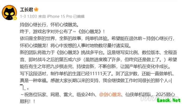 《剑心雕龙》由网易雷火事业群旗下临安24th工作室开发,工长君亲自担任制作人。他曾担任《古剑奇谭1/2》《仙剑奇侠传3/外传/4》等经典国产单机RPG的监制,在剧情叙事与世界观构建方面拥有深厚经验。此次他以“退休前持剑心继长行”为寄语,致力于打造一款纯正的国产仙侠单机新作。