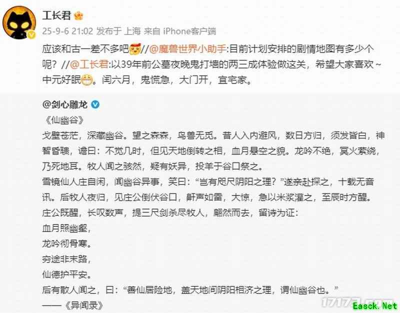 近日,官方发布了名为《仙幽谷》的全新场景设定图,画面仙气缭绕又暗藏诡秘,迅速在玩家社区引发热议。工长君亲自回应,透露该关卡的设计灵感部分来源于他39年前在公墓夜晚遭遇“鬼打墙”的亲身经历,仅取其“两三成体验”便已构思出如此场景,并幽默留言:“中元好眠。闰六月,鬼慌急,大门开,宜宅家。”