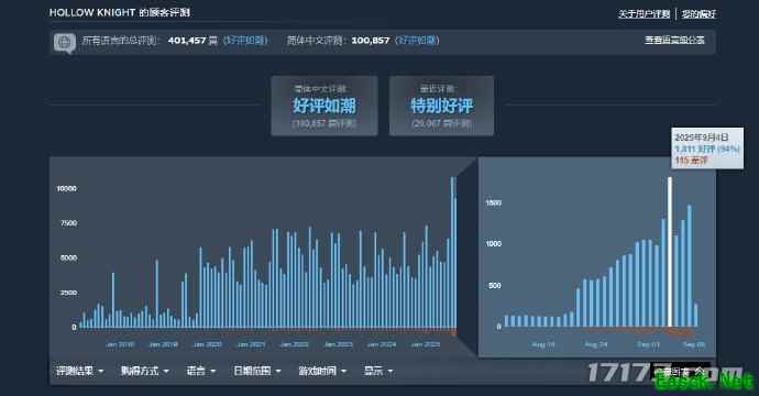 目前,《空洞骑士》在Steam平台的简体中文评价区依然保持着96%的“好评如潮” 评级,且每日新增评价数量甚至超过了《丝之歌》发售前的水平,足见玩家对其持久的热爱与认可。