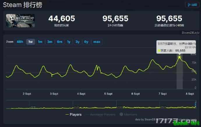 经典类银河战士恶魔城游戏《空洞骑士》再次证明了其“神作”地位的不可撼动。据SteamDB最新数据显示,该游戏在昨日(9月7日)迎来了95,655人的Steam同时在线玩家峰值,创下自2017年发售以来的历史新高。