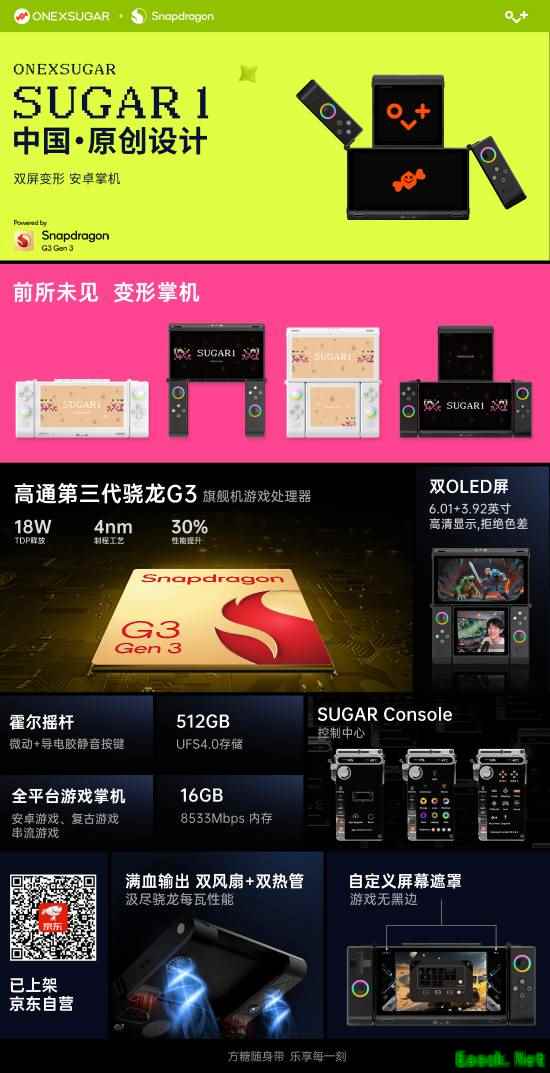 在今天的壹号本发布会中,全新双屏安卓变形掌机壹号方糖ONEXSUGAR SUGAR 1正式发布,定价3999元!