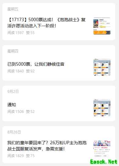 Q:停服的这些年里,有没有用某些方式继续关注或回忆这款游戏? A:我本身就是做“韩服泡泡战士”微信公众号运营的,关于韩服这些年的更新和活动我都会持续关注。 Q:您是通过什么途径了解到17173这次「复活许愿」活动的? 得知《泡泡战士》获得高票时,是什么样的心情? A:我是一开始通过哔哩哔哩偶然刷到了一个UP主叫“老管子游戏”的,他当时在视频中提到了17173目前有一个复活老游戏的活动,于是我怀着非常激动的心情在公众号拟了一篇拉票的文章号召玩家们一起帮助投票。 得知《泡泡战士》获得高票时,我的心情真的难以用语言完全形容。非常激动,甚至有点想哭,这么多年过去了,原来还有这么多人和我一样深爱着、惦记着这款游戏。感觉所有的努力和期待都没有白费,仿佛真的看到了它重新回来的希望。