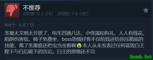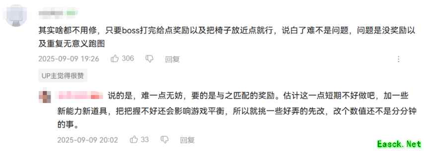 不过也有玩家认为,降低难度的两个boss本身难度就不高,游戏更多的问题是过少的“椅子”存档点,导致每次去boss房都要365里路跑图,跑图的过程中还有过多的跳跳乐环节。