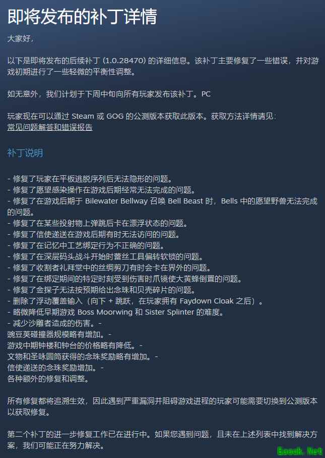 昨日(9月9日),游戏开发团队Team Cherry发布了一则公告,表示下周将推送更新补丁,除了bug修复外,还将降低boss难度,以及增加掉落物。更新补丁将于下周中旬推送。