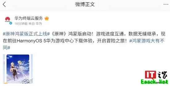 华为终端官方宣布,《原神》鸿蒙版游戏进度互通,数据无缝继承。玩家可前往 HarmonyOS 5 华为游戏中心下载体验。