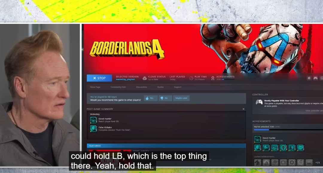 喜剧演员兼脱口秀主持人柯南·奥布莱恩近日在其节目中试玩了即将发售的《无主之地4》,并以一贯的夸张和幽默风格带来了一段颇具话题性的实机演示。
