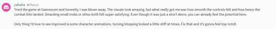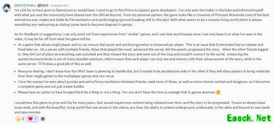 也有玩家认为,这款游戏融合了《幽灵公主》的美术与《塞尔达传说:旷野之息》的理念设计,打造出了体量庞大且迷人的生动世界,同时也针对现场试玩时遇到的一些缺憾(如目前的生存系统较为粗糙,缺乏饥饿、口渴条等设计)给出了意见反馈。