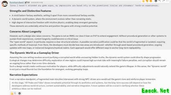 而在海外的社区讨论版上,更是有不少在现场试玩过《山外山》的玩家给出了正面反馈——一位撰写长评的玩家表示,这款游戏的青铜时代东方幻想背景令人着迷,动态的世界系统和环境演化非常真实,高交互高自由度且符合物理直觉的玩法非常有趣,《山外山》展现出了令人印象深刻的潜力,其未来相当值得期待。