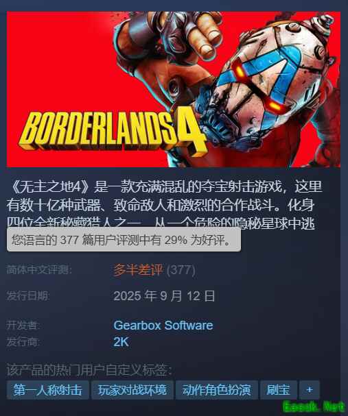 《无主之地4》发布后,优化问题引发了玩家们吐槽,即使在高端硬件上,游戏帧率也较低,而且经常崩溃。,以至于发布当天Steam好评率仅为29%。