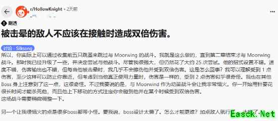 然而玩家群体间关于难度的讨论却没有因此消退,外网Reddit关于呼吁游戏官方取消Boss两点接触伤害的帖子再次引发玩家热议