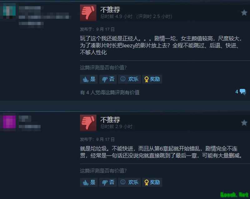 给出差评的玩家认为游戏剧情一坨,女程不能跳过、后退、快进、不够人性化。剧情完全不连贯!