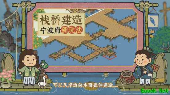 大人可在宁波府水岸区域进行自定义延伸拼接「栈桥」,扩大布局区域,打造独具特色的渔乡风情。栈桥上可放置「渔网铺子」「鱼干坊」「盐渍鱼肆」等建筑,大人可充分利用水面上的空间,为治下之城拓展更多区域。