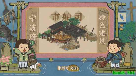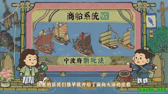 渔船出海归来,带回满满的鱼获,不但可以放到渔人集市售卖,还能在连家渔船享受新鲜的美味。不仅如此,捕获的鱼可以拿到鱼干坊制成鱼干,鱼干亦是宁波府不可或缺的重要资源哦! 栈桥水边悬,商船破浪行! 宁波府的繁荣离不开水运航海经济的发展,而居民们赖以为生的渔船、商船,还有栈桥,就都需要通过「市舶司」来建造。