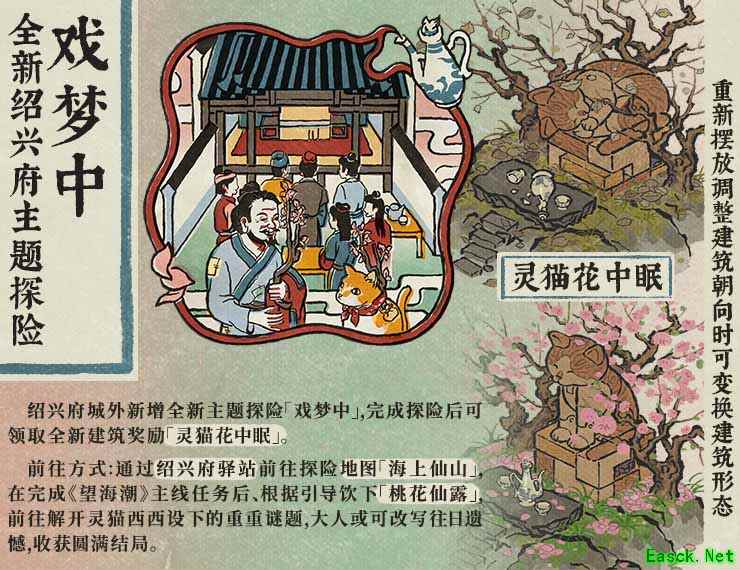 绍兴府城外新增全新主题探险「戏梦中」,完成主线任务后饮下「桃花仙露」,解开灵猫西西设下的重重谜题,大人或可改写往日遗憾,收获圆满结局。 成功解开所有谜题,还可领取全新建筑奖励「灵猫花中眠」,重新调整建筑朝向时,还可变换建筑形态。 入画江南里