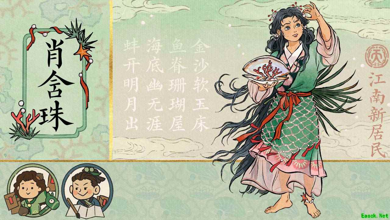 「肖含珠」是一位拥有十四岁女孩外表的蚌精,她心怀远大梦想,希望终有一日能像郑和大人一般站在甲板上迎风而立,指挥浩浩荡荡的船队征服大海。知府大人可通过收集「篝火大会」的火花,在周年庆典期间进行免费兑换,收获这位古灵精怪的江南新居民。 雕梁画栋间