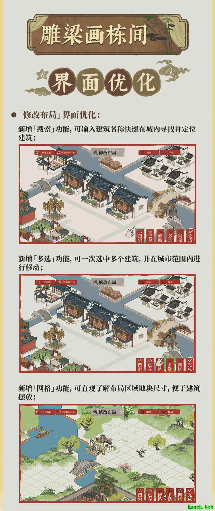 在4.0.0版本,「修改布局」功能迎来优化及功能更新,以期为知府大人建设和管理治下州府带来更好的游戏体验。 新增「建筑搜索」功能,知府大人现可输入城内建筑名称,或点击界面内建筑,即可快速跳转定位城内建筑。新增「建筑多选」功能,知府大人现可一次选中多个建筑,并在城市范围内进行移动。此外,还新增了「地块网格」功能,知府大人可直观了解区域尺寸,便于建筑摆放。 6月27日起,知府大人可前往应用商店下载4.0.0周年版本!7月2日起,周年庆典正式开启,在此期间,诚邀大人前往涛碧沙白的「棕影岛」同度清凉夏日,共赴热闹的「篝火大会」许下心愿,翻阅「周年府志」解锁「江南百景图」五字章,前往全新探险「戏梦中」改写遗憾结局......还有各式庆典限定奖励不容错过!