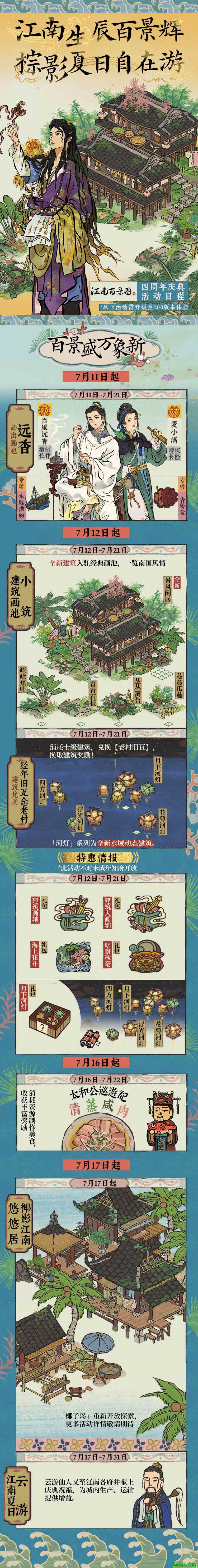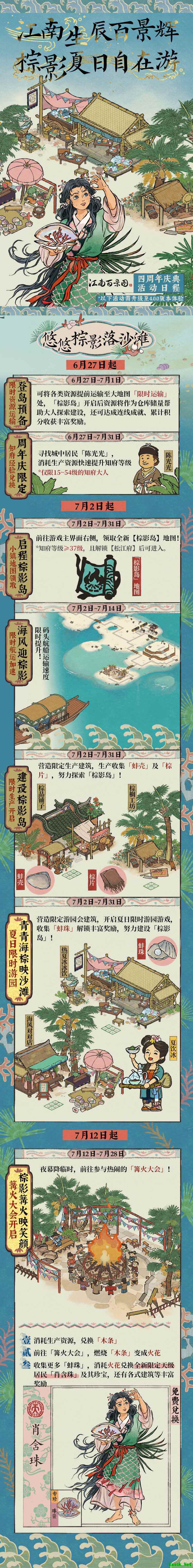 四载江南情,迢迢越山川。 棕影落沙滩,篝火映笑颜。 6月27日,4.0.0周年版本正式上线! 7月2日起,四周年庆典系列活动日程正式开启!