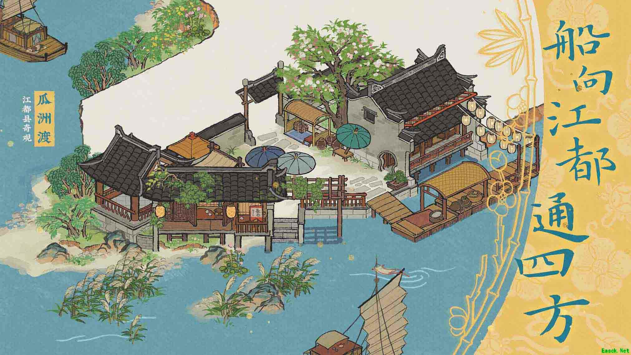 新增扬州府隶属小镇「江都县」,知府大人可在4月26日3.3.0版本更新后,根据限时积分任务指引解锁「江都地图」,前往这座河湖交织的小镇。「江都县」得名于“江淮之水都会于此”,长江与京杭大运河在此交汇,使此地成为水路要津。 在一处形如“瓜”的水岸上,一座名为「瓜洲渡」的奇观建筑伫立于此,千百漕粮盐船在此渡口吞吐。如人们耳熟能详的王安石作《泊船瓜洲》:“京口瓜洲一水间,钟山只隔数重山。春风又绿江南岸,明月何时照我还?”瓜洲渡的魅力正如诗中所描述,正等待着知府大人前去探访。 雕梁画栋 花中江南