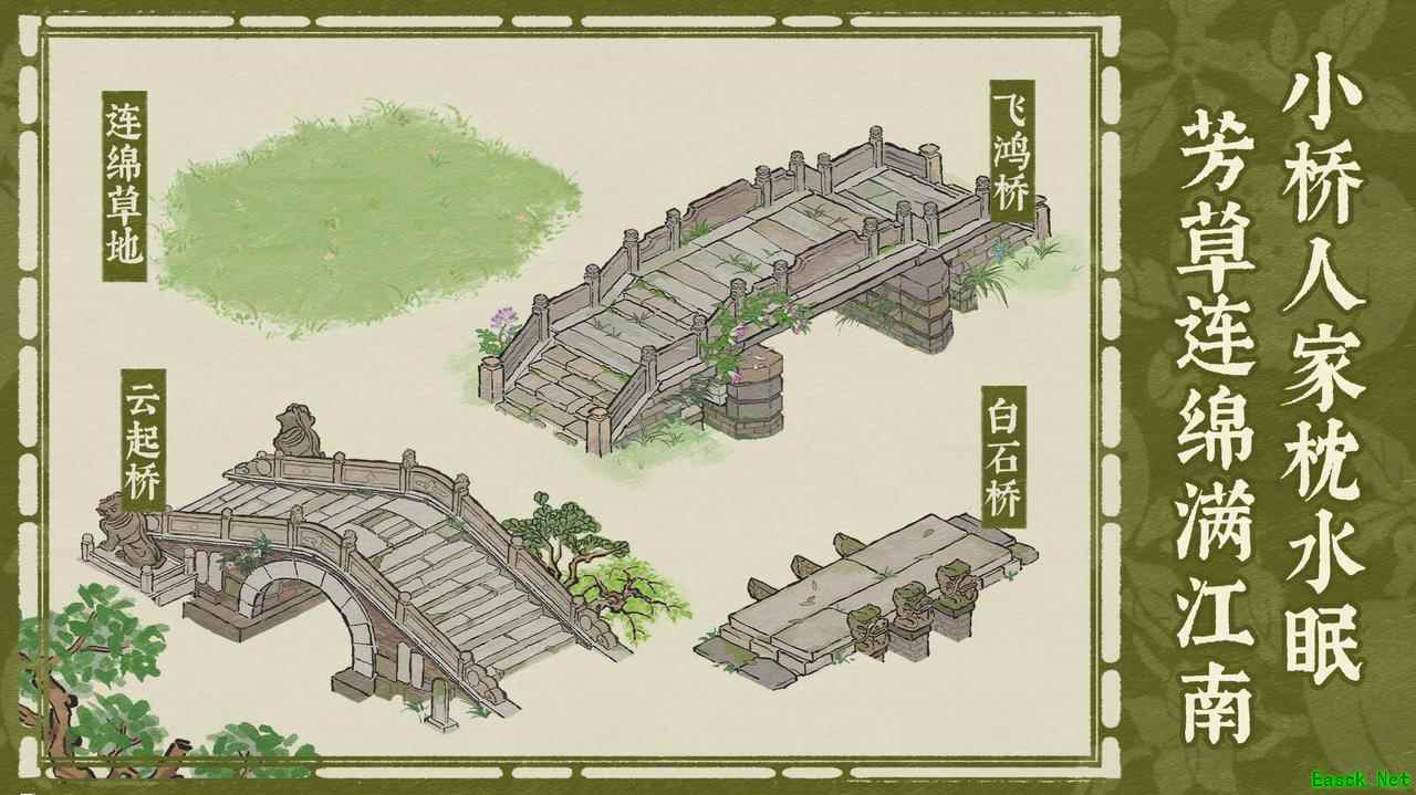 水乡小巷多,人家尽枕河。 本次版本更新新增【白石桥】【云起桥】【飞鸿桥】3个桥梁装饰,知府大人可前往各州府的营造界面,根据城内水域距离选定桥梁,丰富水乡景色。 此外,各州府同时新增全新拼接装饰【连绵草地】,大人可将其自由铺设于城内空白区域,获得连绵不断的碧草地。桥街相连、碧草绿浪,知府大人尽可将治下之城的“小桥、流水、人家”构成一幅宁静秀雅的画卷。 幸有良朋同雅集,一觞一咏乐无穷