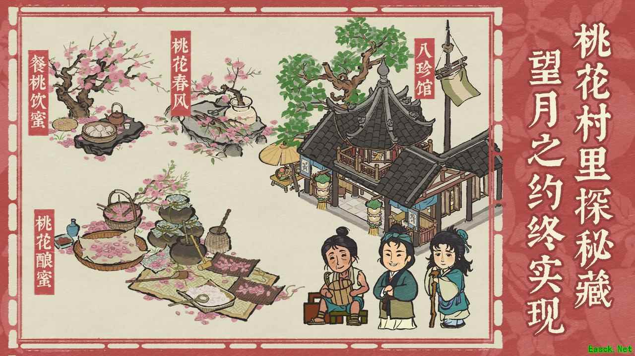 大人可选择加入或创建【文人雅集】,与其他诸位大人共筑雅景、同沐风雅。作为雅集的集长,可在本次版本更新后为雅集换上5种全新雅集标志,彰显独特雅集风格。 在【雅集商行】中,新增多个可兑换限定建筑奖励——【四方城北】【四方城南】【四方城东西】及【四方城中】,大人可将它们相邻摆放、自由布局,获得多种效果。 桃花村里探秘藏,望月之约终实现