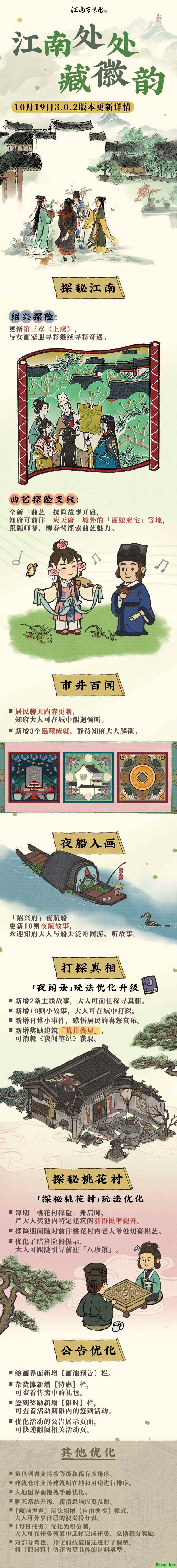 在老板娘的苦心经营下,应天府「金陵客栈」的生意越来越红火,吸引来了两位新住客「登山王一览」和「茶学士清谷」,完成其住客故事后即可邀请入住江南。同时,客栈厨师研制出了「叫花鸡」、「桃脂烧肉」等多种新菜品,消耗香料可烧制款待食客。 此外还新增了「立式宫灯」、「冰养盆」等多件客栈家具,大人可对客栈内部进行自定义布局,吸引更多食客光临客栈,让生意更上一层楼! 探秘江南,寻访秘闻