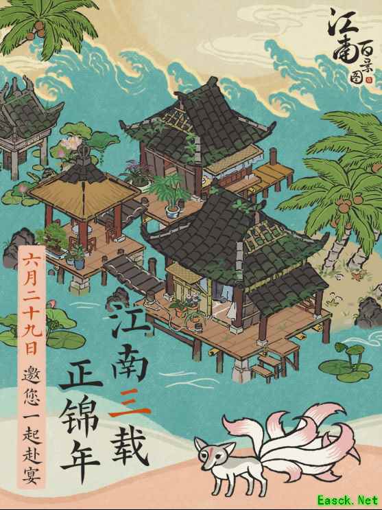 【画中百景岁岁安,椰影江南悠悠居】 7月2日起,《江南百景图》正式开启「三周年庆典」——结伴闯关双人探险「鲤跃记」,前往「椰子岛」共赴盛宴,解锁「三周年限定福利」、翻阅「三周年府志」,还有各式全新建筑不容错过。