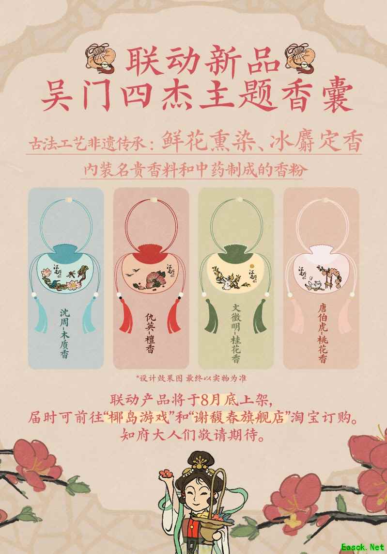 与此同时,双方也将共同推出联动商品【吴门四杰主题香囊】。以明朝著名的吴门四杰为灵感,传承鲜花熏染,冰麝定香技艺,打造传统而又年轻化的香囊产品。香囊中内装以名贵香料和中药材制作的香粉,展现传统匠人工造。联动产品将于8月底上架,届时可前往淘宝店铺“椰岛游戏”和“谢馥春旗舰店”,了解更多产品信息。 江南百景图X谢馥春联动活动将于8月4日开启,持续至9月4日。香粉郁郁之时,何不同游江南? |