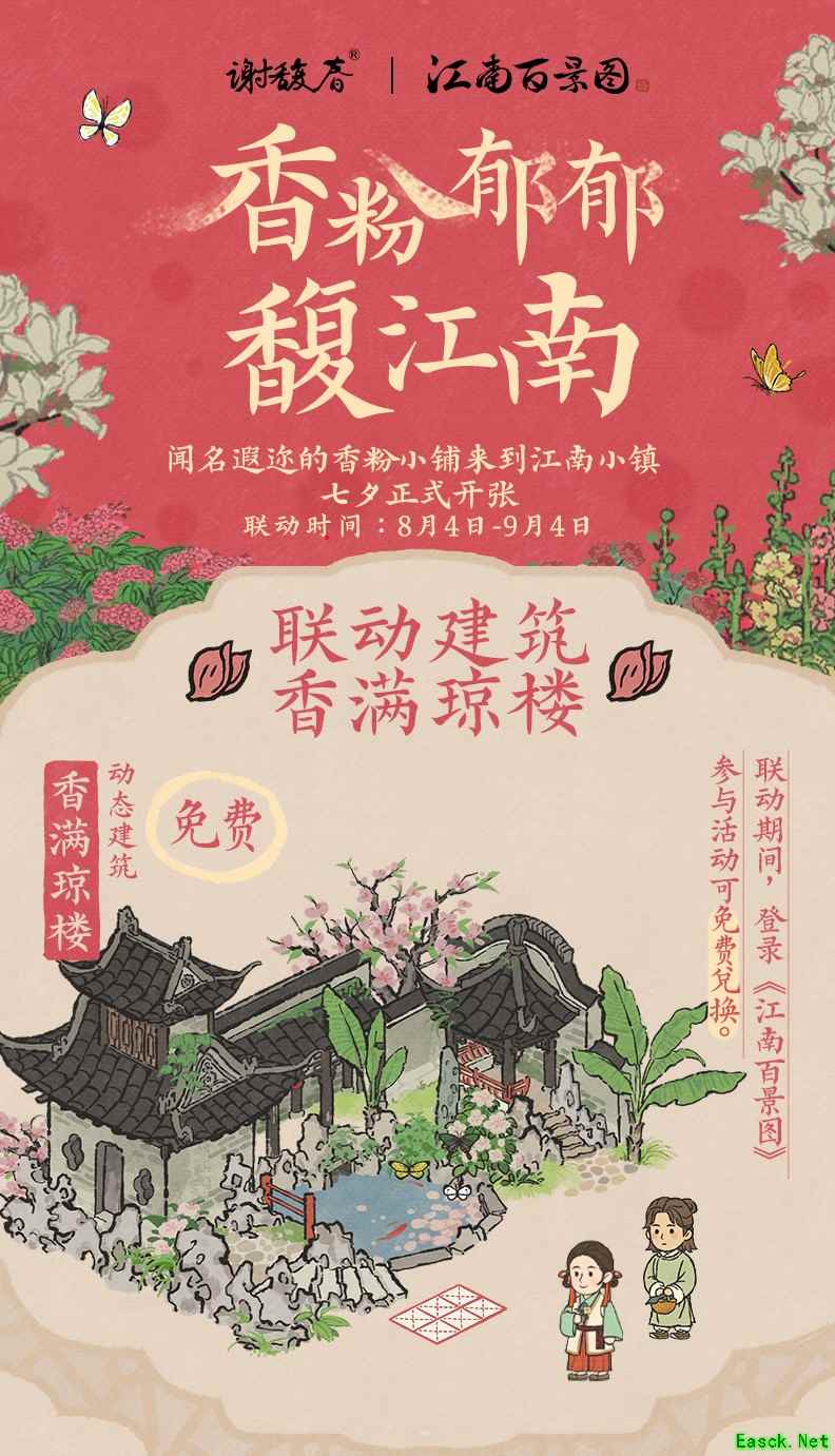 《江南百景图》宣布将与中华老字号、国货谢馥春跨界联动,联动时间为8月4日到9月4日。双方不仅将共同推出动态建筑“香满琼楼”在内的数字联动内容,也将通力合作打造【吴门四杰主题香囊】等实体产品。描写江南风光的移动游戏首次联手百年化妆品香粉品牌,向年轻一代介绍传统扬州脂粉技艺的隽永香气。 天下香料,莫如扬州