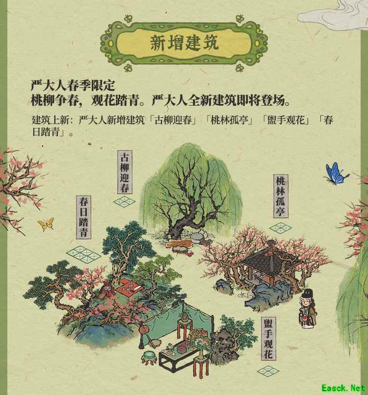 桃柳争春,观花踏青 豆蔻梢头,春风十里,江南无所有,聊赠一枝春。 1.4.1版本更新后,严大人将为玩家带来4款全新的春季限定建筑:古柳迎春、桃林孤亭、盥手观花、春日踏青。 松江府特有的盐商同样更新了一批花卉装饰,现在前往游戏内参与资源兑换活动还可自选装饰。趁着春意正浓,速来唤醒你的江南小镇吧!