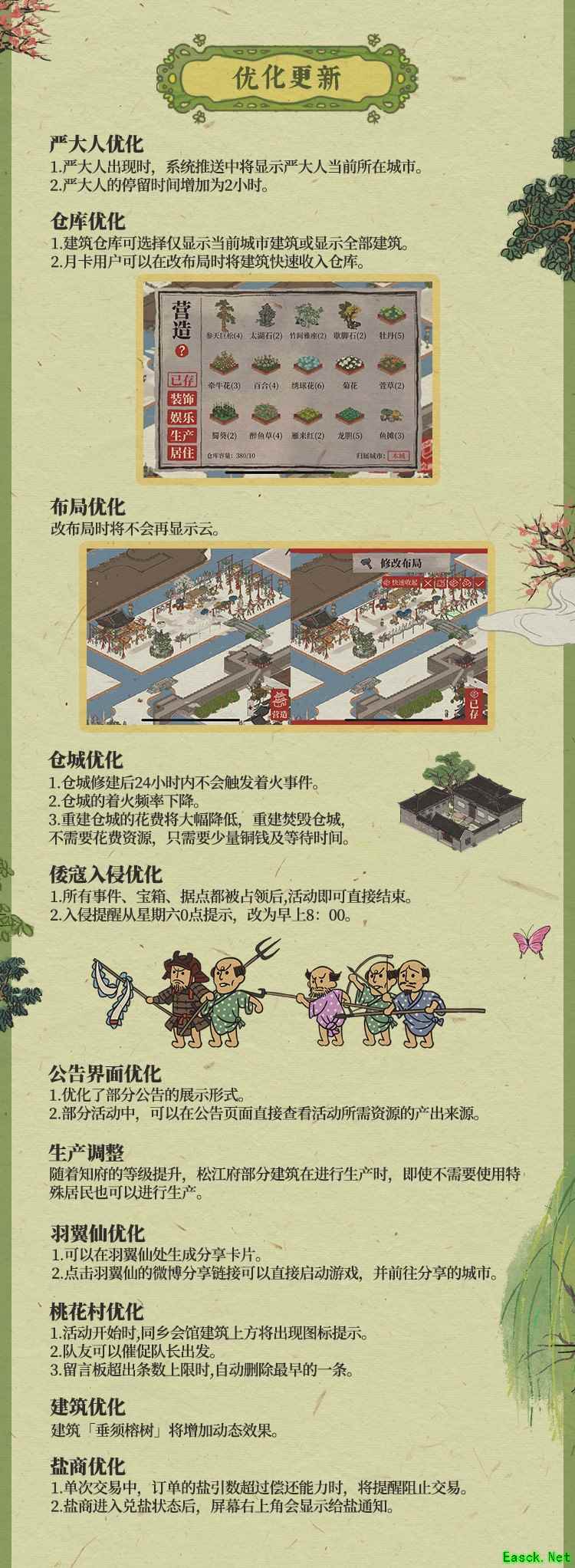 体验优化,玩法升级 关于严大人系统、活动随机性、仓库优化、倭寇系统等,《江南百景图》制作组在本次版本更新中做了大量优化。