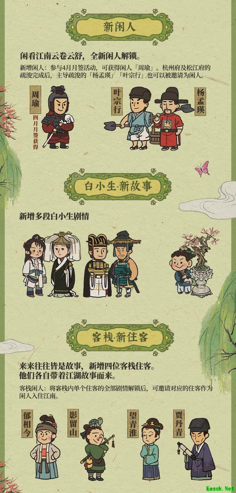 闲看江南,闻趣江湖 此次更新后,稀奇有趣的居民轶事又增加了!新增四位客栈住客以及多段江湖八卦,来来往往皆是故事。在这个江湖中,处处飘散着他们的传说,这些均等待着你前往游戏亲自探索!