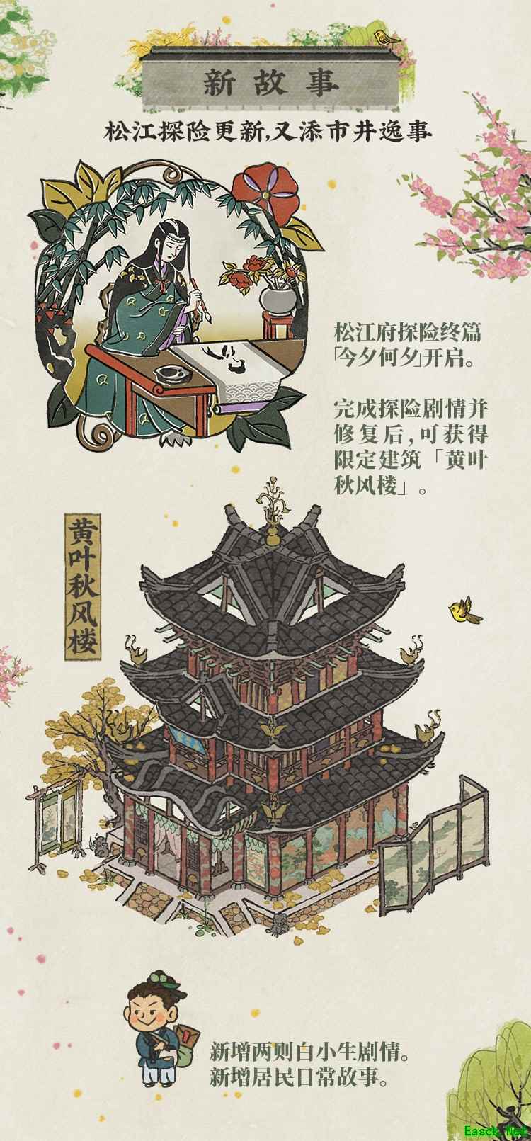再忆松江!市井逸事增加 随着1.7.0版本更新,等待已久的松江府探险终章【今夕何夕】终于到来。 玩家可以深入了解在松江府发生的往事。完成探险剧情后,还可获取限定建筑【黄叶秋风楼】。