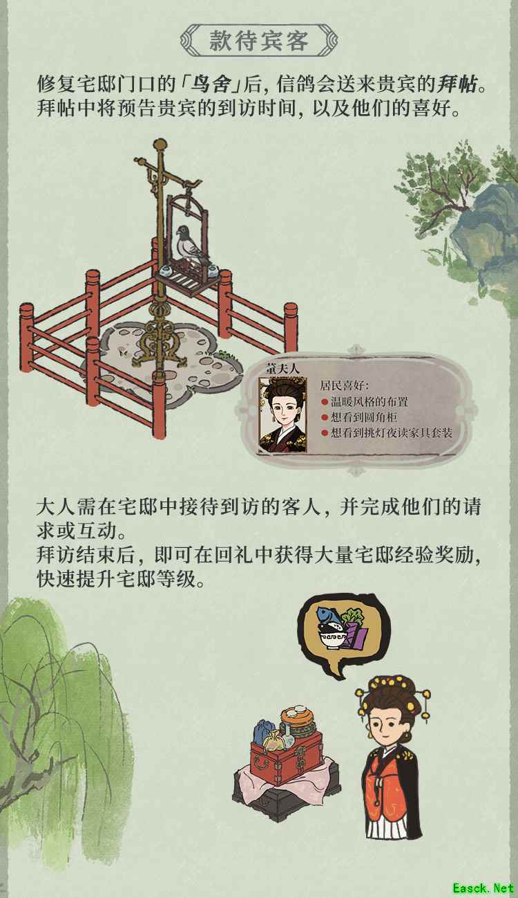 此外,在修复宅邸的鸟舍之后,信鸽会带来贵宾的拜帖。玩家根据他们的需求更换家居装潢,若能赢得贵宾们的欣赏,便可从他们那里获得丰厚奖励。