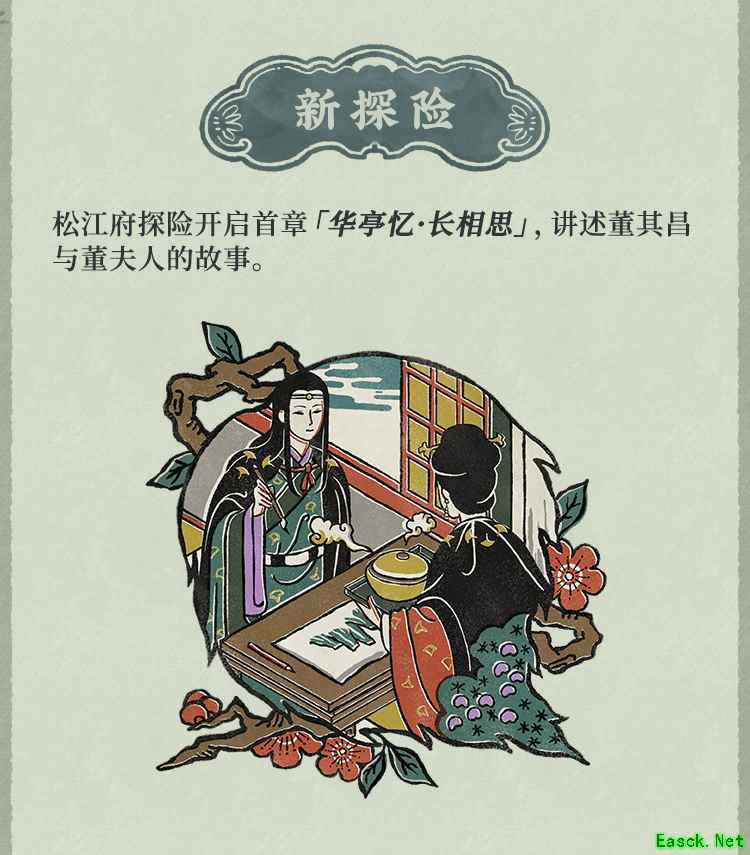 喜闻身边事,更多小城故事解锁! 本次更新后,可以解锁松江府探险首章剧情——华亭忆 长相思,了解董其昌及董夫人的往昔回忆。