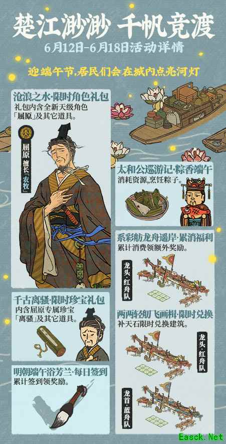 -【系彩舫龙舟遥岸】累消福利开启。 累计消费补天石到一定数额,即可获得全新动态建筑【龙头红舟队】; -【两两轻舠飞画楫】限时兑换活动开启。 活动期间内,使用补天石即可兑换全新动态建筑【龙头红舟队】及【龙首蓝舟队】。 -【沧浪之水】限时角色礼包开放购买。礼包内含全新天级居民【屈原】及其他道具; -【千古离骚】限时珍宝礼包开放购买。内含屈原专属珍宝【离骚】及其他道具。
