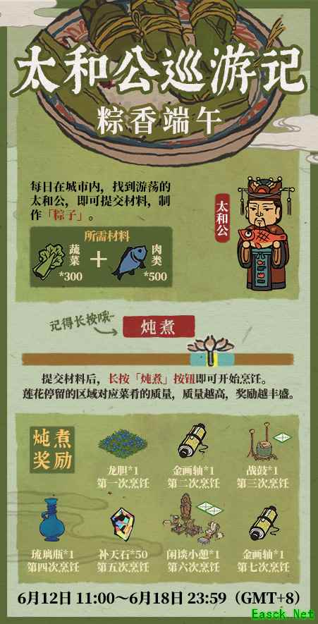 -【明朝端午浴芳兰】每日签到开启。 累计签到即可领取补天石、金画轴、听琴松等端午好礼; -【太和公巡游记•粽香端午】活动开启。 在城中找到太和公,提交食材,烹饪粽子即可领取补天石、金画轴、闲谈小憩等奖励;