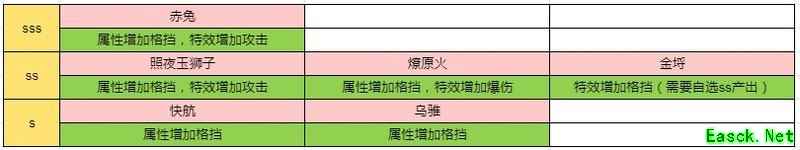 名驹选择建议:与珍宝选择类似,优先考虑具有格挡属性的物理类宝物,例如:赤兔(SSS)、照夜玉狮子、燎原火、金埒(SS),以及快航、乌骓(S级)。 名驹推荐