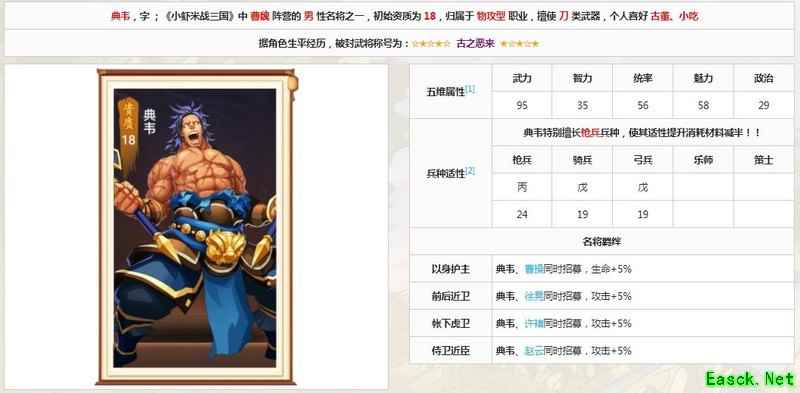 小虾米战三国中,典韦作为魏国首冲武将,凭借怒技远程输出、格挡回血、受击反击等强力机制,始终稳居玩家核心阵容之列。本文将深入解析典韦的武将优势与养成策略,助你打造战场硬核核心! 典韦基础属性解析