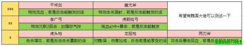 神兵推荐选择:干将或蚩尤斧为最佳,其次可选李广弓或虎筋弦弓,备选包括虎头枪、龙胆枪及两刃斧。 总体来说,神兵选择特效较多的类型,这样典韦在反击时也能附带这些效果(具体生效情况尚未确定,目前仅是推测,还需进一步验证)。 神兵推荐