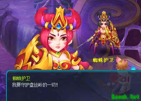 盘丝岭的主色调是诡谲的紫色,就连地面也是如此,让人容易联想到蜘蛛、中毒等危险的概念。不过最让我感觉渗人的还是地图边角里的一些紫色东西,远看还以为是花朵,其实都是虫卵啊! 【两位护卫 高下立判】