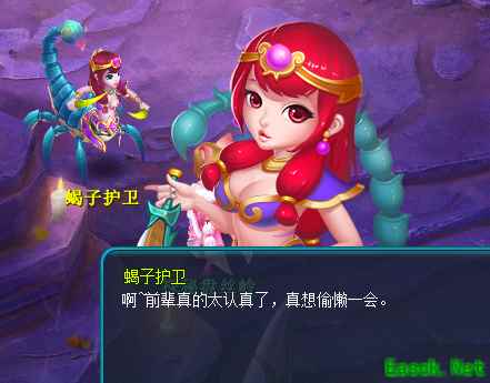 接下来我们去看一看盘丝岭的NPC们,比如这位蝎子护卫。跟她对话后,可以看出来这位是新晋加入盘丝岭的新人,不过一看就很擅长于摸鱼学,不好好干护卫的工作,一整天就想着偷懒呢...