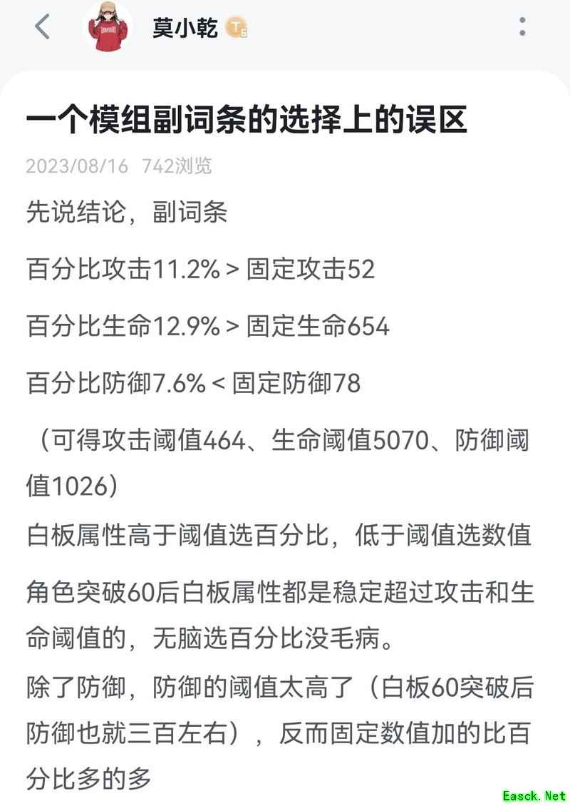 如今防御阈值可以通过堆叠数值词条来达成。 在公式②中,括号内各项加起来的数值未达到某个临界值之前,选择防御类副词条的收益更高;一旦超过这个临界值,则百分比防御副词条更为划算。目前游戏中并没有以防御为主堆属性的角色,护盾类角色也多为主生命、副防御的配置。因此,在生命与防御之间如何搭配才能实现收益最大化,成为一个需要权衡的问题。需要注意的是,这种情况仅适用于防御类副词条,攻击和生命类副词条仍以百分比属性为最优选择(仅针对副词条进行了阈值计算)。 |