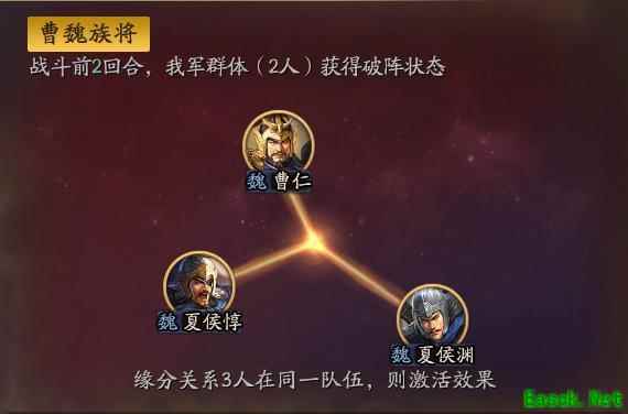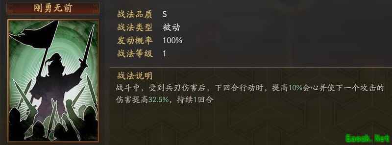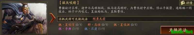 在事件战法拔矢啖睛中,可通过5星夏侯惇、高顺、夏侯渊,搭配4星李典与3星吕虔,兑换战法刚勇无前。该战法同样具备100%的发动率,属于被动型兵刃增伤战法,适用于中慢速输出队伍。其效果最高可提升20%会心伤害,与西凉铁骑相近,同时还能在一定程度上降低敌方下一次攻击的伤害,减伤比例最高达65%,兼具输出与防御能力。适合用于兵刃伤害为主的武将,如张飞、孟获、董卓等,若再搭配击其惰归、绝地反击或横扫千军等战法,整体输出表现将更加出色,伤害数值更具爆发力。 四、缘分