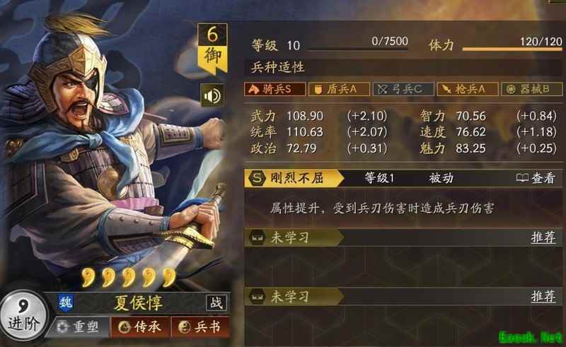 夏侯惇在游戏中的设定基本延续了他在历史上的形象。骑兵评级为S,盾兵和枪兵都是A,武力和统率较高,速度达标,智力在众多武将中也算不错。整体来看,他是一位初看平平、细品惊艳的武将,只要运用得当,实力相当强劲。